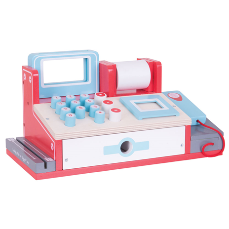 Questo coloratissimo registratore di cassa in legno dispone di una funzionale tastiera, di un pratico rullo dove si può scrivere e registare i calcoli fatti, di un cassetto scorrevole per depositarvi l'incasso e svariati tipi di monete e carte di credito. Contiene anche la pistola a codici a barre per tenere sempre sott'occhio il magazzino.