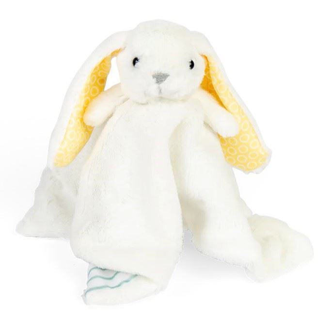 Il tessuto è estremamente morbido e leggero, ideale fin dalla nascita. Il coniglietto ha un musetto dolce e lunghe orecchie facili da afferrare, pensate per le piccole mani dei neonati. L’interno delle orecchie, con una texture liscia differente, stimola il tatto in modo naturale e delicato.