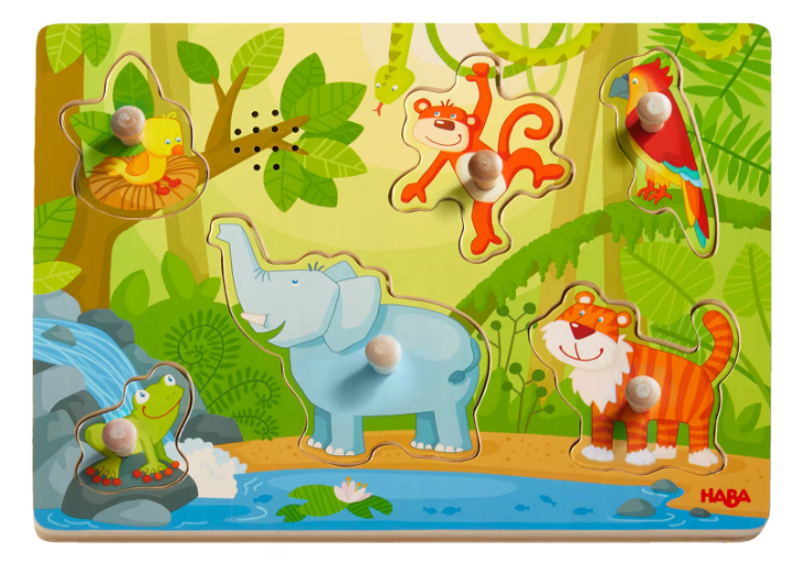 Che verso fanno gli animali della giungla? La scimmia, l’elefante, il pappagallo, la tigre, la rana e l’uccellino sono pronti a farsi riconoscere con questo puzzle sonoro in legno pensato per i bambini a partire da 1 anno.
