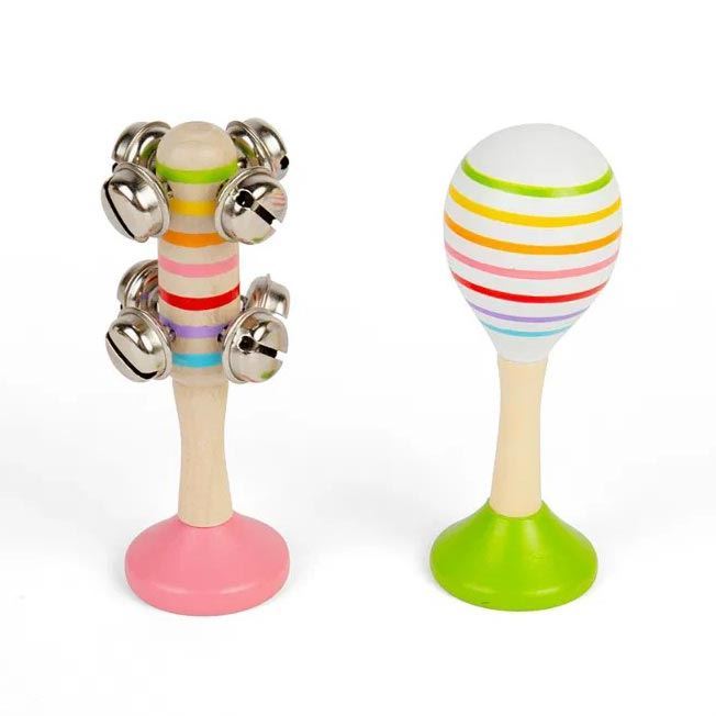 Questo set di sonagli a percussione è pensato per accompagnare neonati e bambini nelle prime esplorazioni musicali. Due strumenti diversi, ma complementari: un sonaglio con campanellini e una piccola maracas, entrambi leggeri e facili da impugnare.