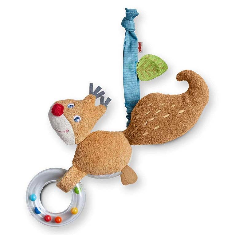 Questo sonaglio scoiattolo di Haba si fissa facilmente a passeggino, seggiolino auto o lettino grazie al laccio in tessuto elastico, rimanendo sempre a portata di mano del bambino.